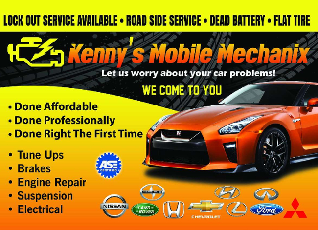 Are you tired of waiting at a repair shop? We Come To You! To schedule an ASE Certified mobile mechanic, call us now (954)588-1006. We'll come to work on your car at your home or office. Our Certified mechanics are trained, licensed, and certified to handle any automobile or truck repair. Car won't start?! Call now to speak with a mobile mechanic –Kenny’s Mobile Mechanix. Our representatives will send a mobile mechanic to assist you. It doesn't matter where you are, you can get back on the road with the help of our mobile mechanics. We service Broward, Dade, Palm Beach County and surrounding areas. Our ASE certified mechanics are trained professionals who can diagnose and repair your car with ease and careful attention to get you back on the road safely. Never used a mobile mechanic service before? Give us a call and we'll be happy to walk you through it! It's quick, simple and convenient. For any mechanical concern, we are ready to help you.